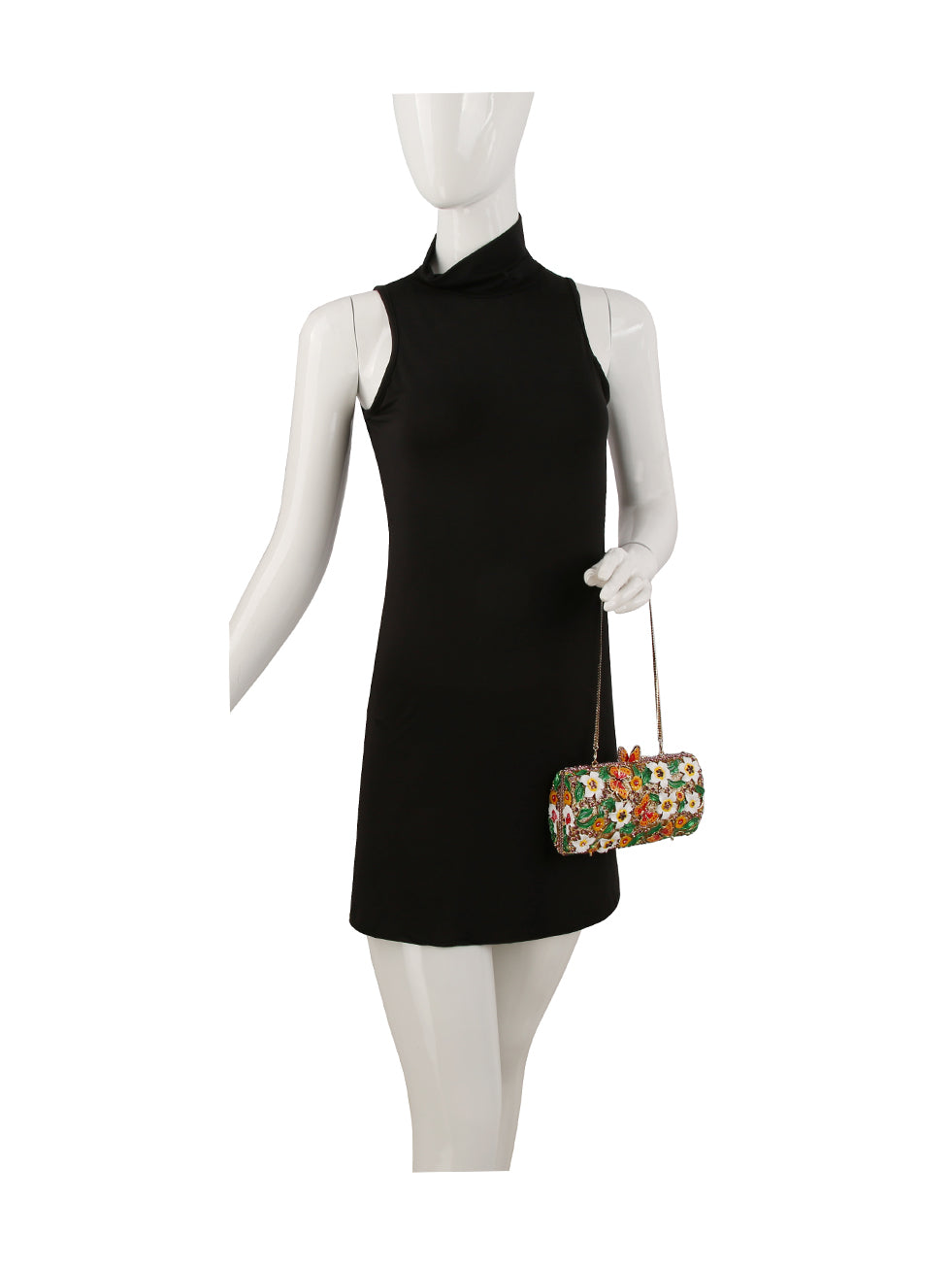 Glittering gold-tone hard case covered in hand-set crystals, enamel flowers, and vibrant butterfly Structured rectangular silhouette with...