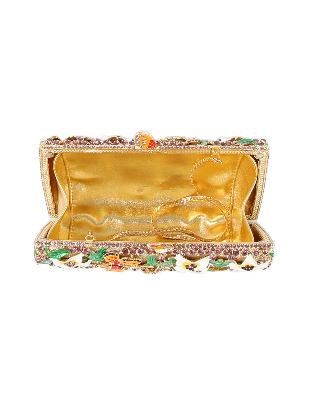 • Glittering gold-tone hard case covered in hand-set crystals, enamel flowers, and vibrant butterfly
