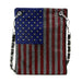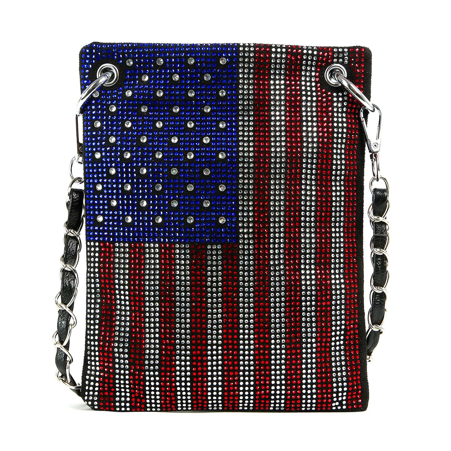 An American Flag motif created with tiny colored rhinestones on a petite cross body sling.